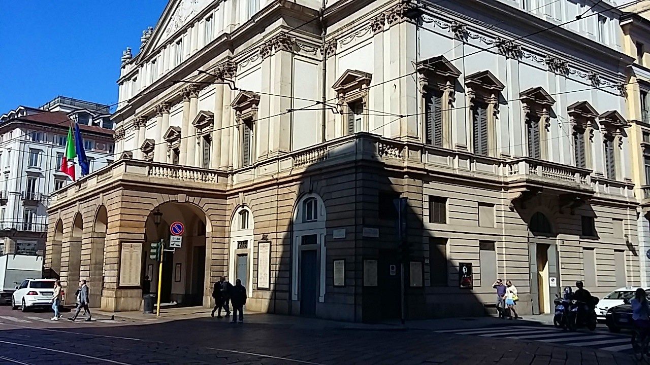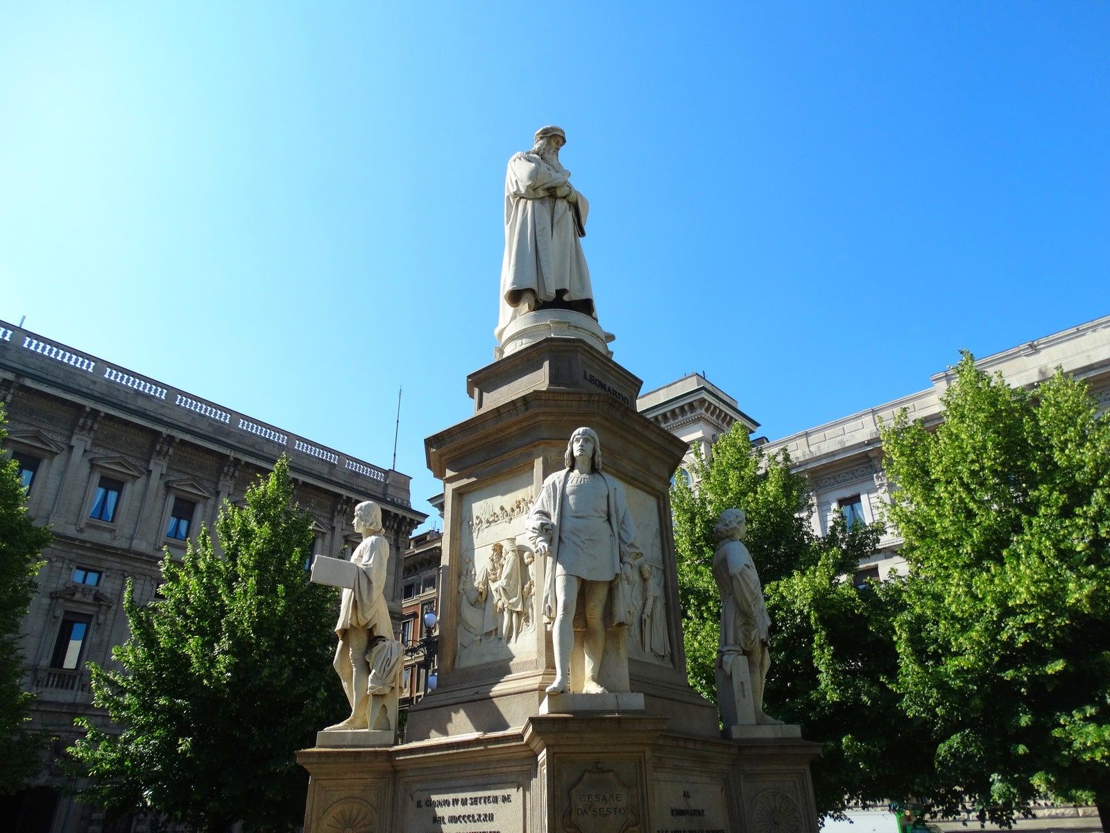 Au terme de la Via Alessandro Manzoni se tient une place où trône une statue majestueuse de Léonard de Vinci. Sur la droite se trouve un grand bâtiment, le célèbre Teatro alla Scala de Milan.