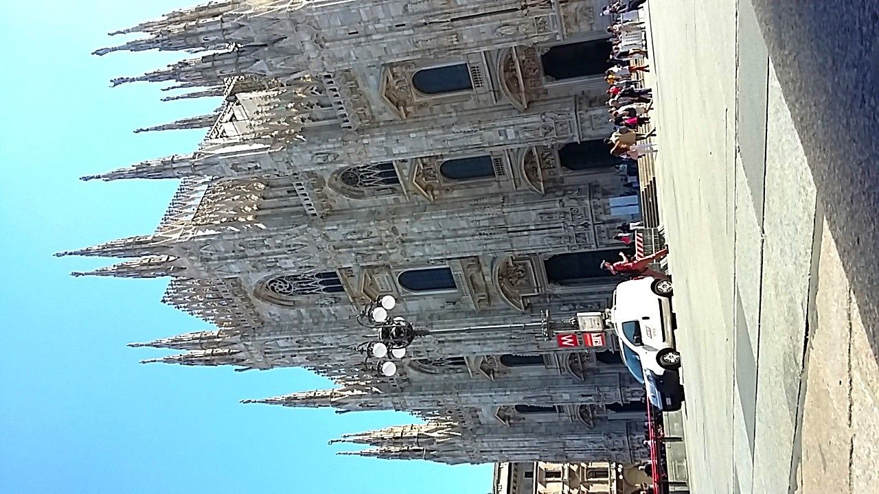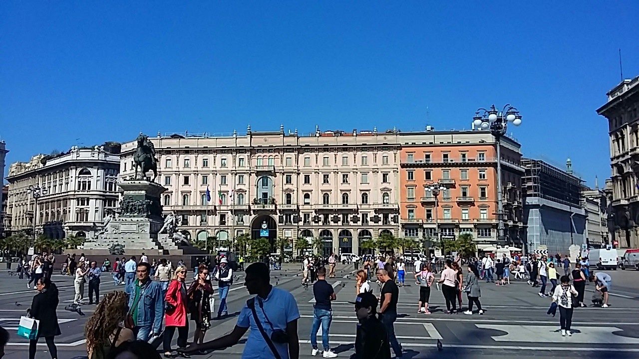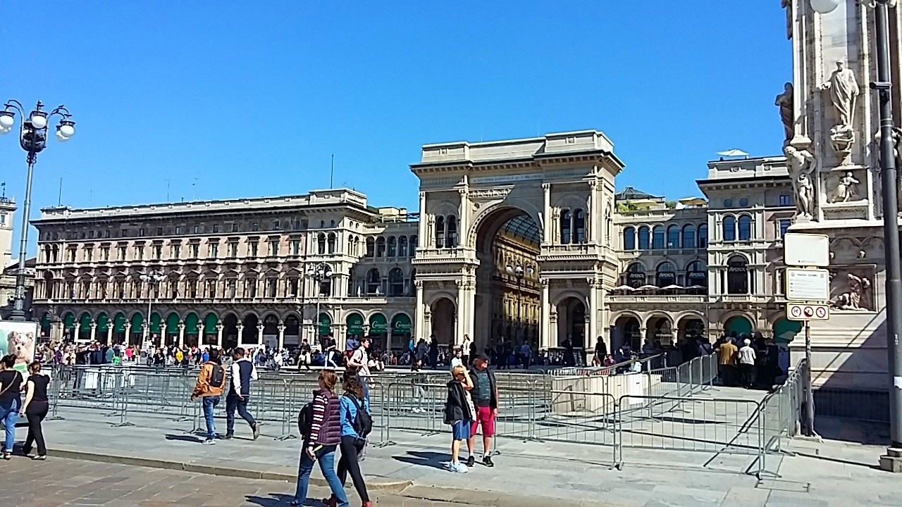 La sortie de la Galleria se fait sur la célèbre Piazza del Duomo. Le Dôme de Milan est sur la gauche, majestueux.