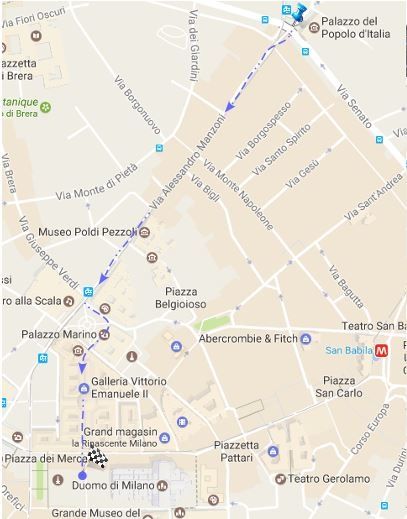 Le circuit par de la Piazza Cavour, aux portes du Quadrilatère de la Mode pour rejoindre le célèbre Duomo de Milan en passant par la Gallerie Victor Emmanuel II ou le théâtre de la Scala. L'itinéraire dépasse à peine le kilomètre mais il fera peut être bon flâner au milieu des boutiques et ainsi rallonger le plaisir. Il faudra donc compter deux bonnes heures pour le réaliser.